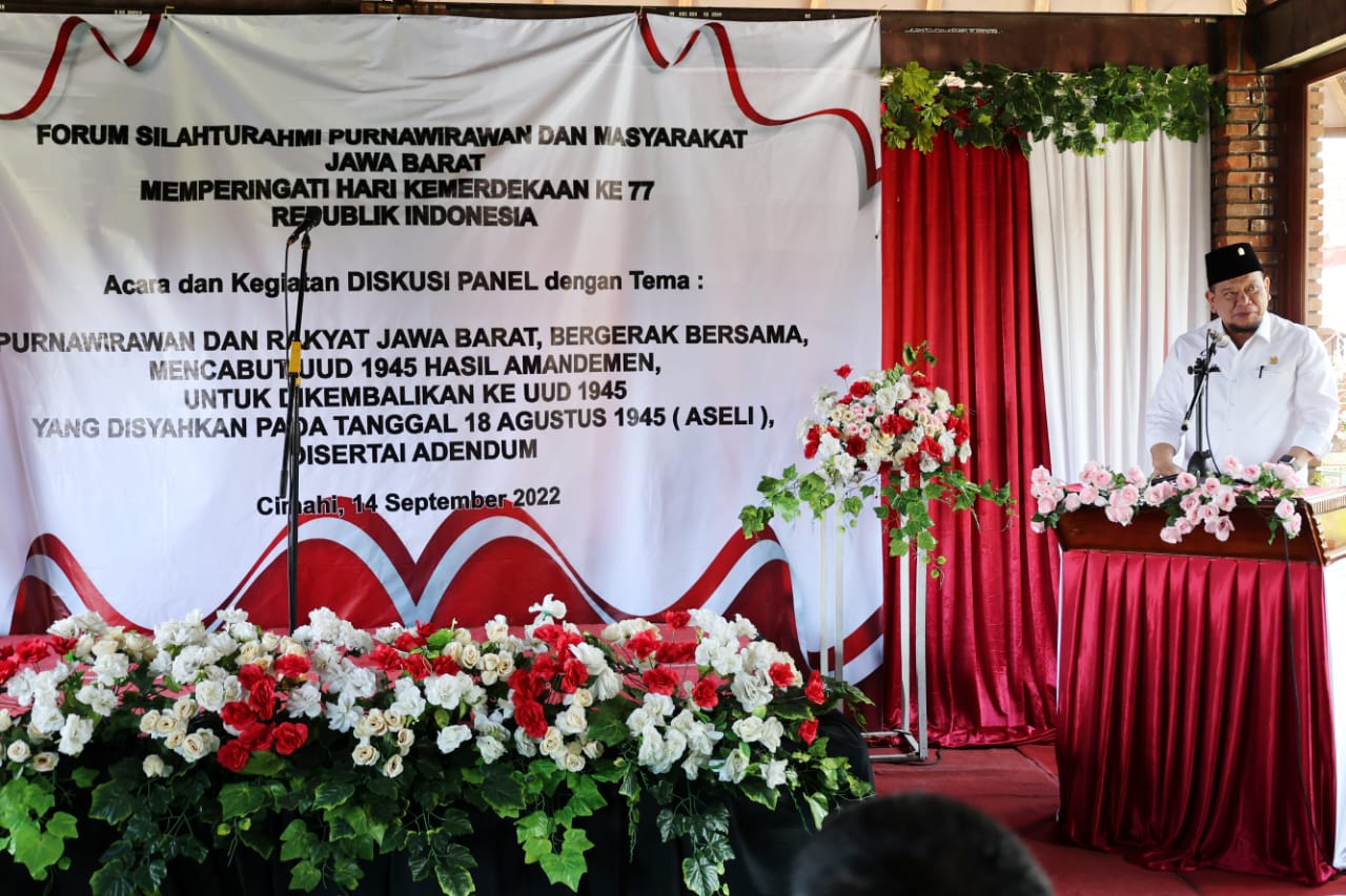Ketua DPD RI AA Lanyalla Mahmud Mattalitti di dampingi senator asal Bandung Eni Sumarni, Senator Asal Lampung Bustami Zainudin, Senator Asal Aceh Fachrul Razi menghadiri acara Forum Silaturahmi Purnawirawan dan Masyarakat Jawa Barat dalam Memperingati Hari Kemerdekaan Republik Indonesia yang ke-77 dengan Tema Purnawirawan dan Rakyat Jawa Barat Bergerak Bersama, Mencabut UUD 1945 hasil Amandemen, untuk dikembalikan ke UUD 1945 yang disyahkan pada tanggal 18 Agustus 1945 (Naskah Asli) disertai Adendum. Acara tersebut bertempat di Cimahi, Jawa Barat (14/09/2022).